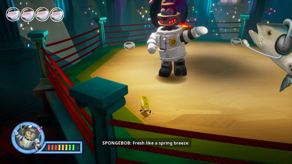 یکی از مزیتهای نسخه TCS به تنوع محیطهایش برمیگردد؛ جایی که هفت دنیای متفاوت انتظار بازیکنان را میکشند که هرکدامشان دشمنان و رنگ آمیزی مخصوص به خودشان را دارند. باب گاهی به یک دزد دریایی تبدیل میشود و از سوی دیگر با ورود به یک دنیای جدید، در نقش نجات دهنده پرنسس سرزمین رنگین کمان قرار میگیرد. رنگ آمیزی مراحل واقعا لذت بخش هستند و از این نظر سازندگان فضای شاد انیمیشن را به خوبی منتقل کردهاند. با این حال طراحی مراحل دست کمی از فاجعه ندارند و بارها پیش میآید که احساس کنید که بازی چیز زیادی برای عرضه ندارد. باب یک سری مناطق را با فرمول بازیهای پلتفرمر رد میکند و پس از آن مبارزات حوصله سربر از راه میرسند که کوچکترین جذابیتی ندارند. با اینکه تنوع دشمنان به نسبت زیاد است، اما مبارزه کردن با آنها هیچ هیجانی را در بازیکن ایجاد نمیکند و این مورد به تدریج او را از ادامه دادن بازی باز میدارد. البته مشکلات TCS صرفا محدود به مبارزات و ساختار مراحل نمیشود و مرگهای بیدلیل و احمقانه که بازیکن در آنها تقصیری ندارد، از بزرگترین ایرادهایی است که بازیکن با آن دست و پنجه نرم خواهند کرد. علاوه بر این قفل شدن فریم بازی در هنگام ذخیره کردن فایلها یکی از مواردی است که به مرگهای ناخواسته منجر میشود.